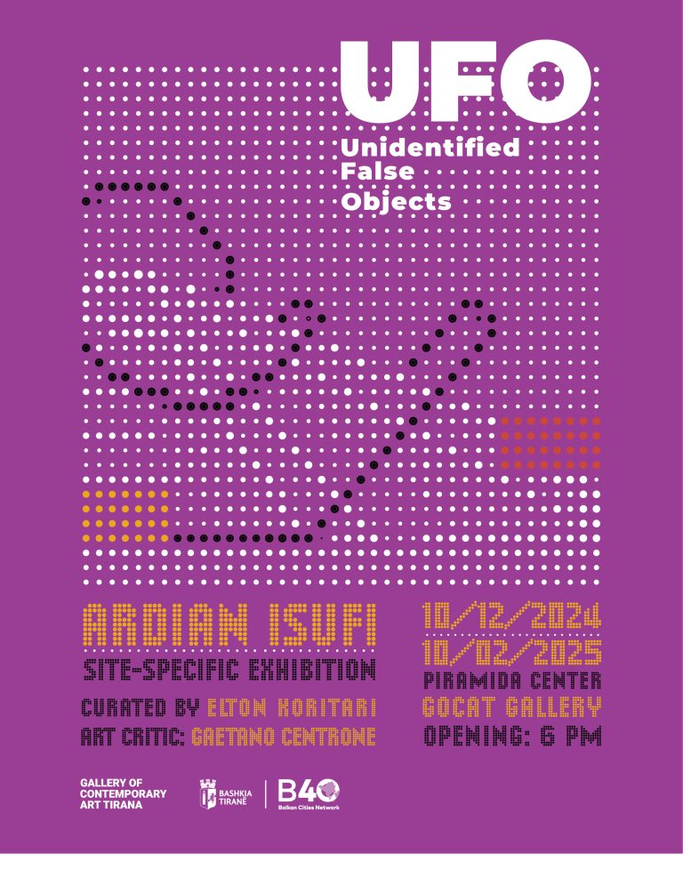 UFO është një ndërhyrje artistike site-specifik në Piramidën e Tiranës, një nga hapësirat më ikonike të kryeqytetit të Shqipërisë. Kërkimi i Ardian Isufit nis nga çështje akute, të cilat vënë në dyshim hapësirat gjeo-kulturore, territorin, trashëgiminë historike dhe ndryshimet në peizazhin urban, i cili qëndron sot pezull midis utopisë dhe distopisë.